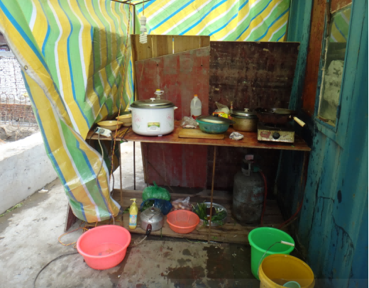 D. 民工使用雨布.模板搭设临时厨房