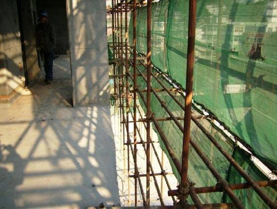 图为落地式钢管外脚手架搭设图片,连墙件按两步三跨设置。从图中楼层可看到的部分,架体连墙件设置是正确的。