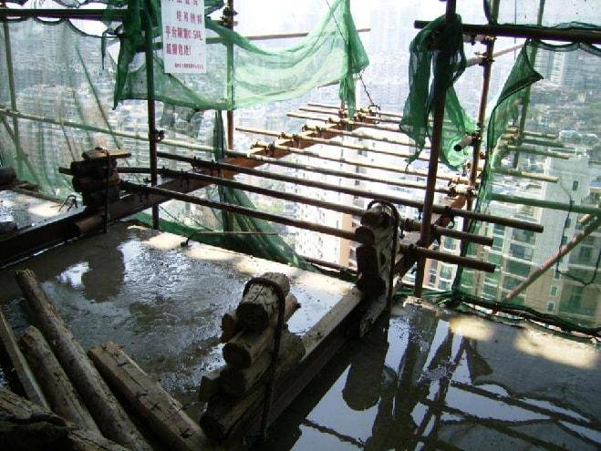 上图为一转料平台搭设图片,悬挑梁固定端长度1.9,下列关于该图片说法正确的是()。