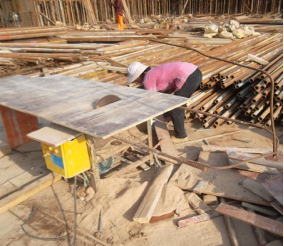 D. 锯沫渣、模板、木方等易燃材料乱堆乱放,未及时清理归堆,堵塞通道